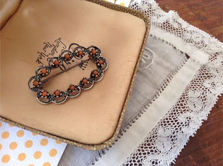ヴィンテージコーラルビーズのスカラップオーバルブローチ