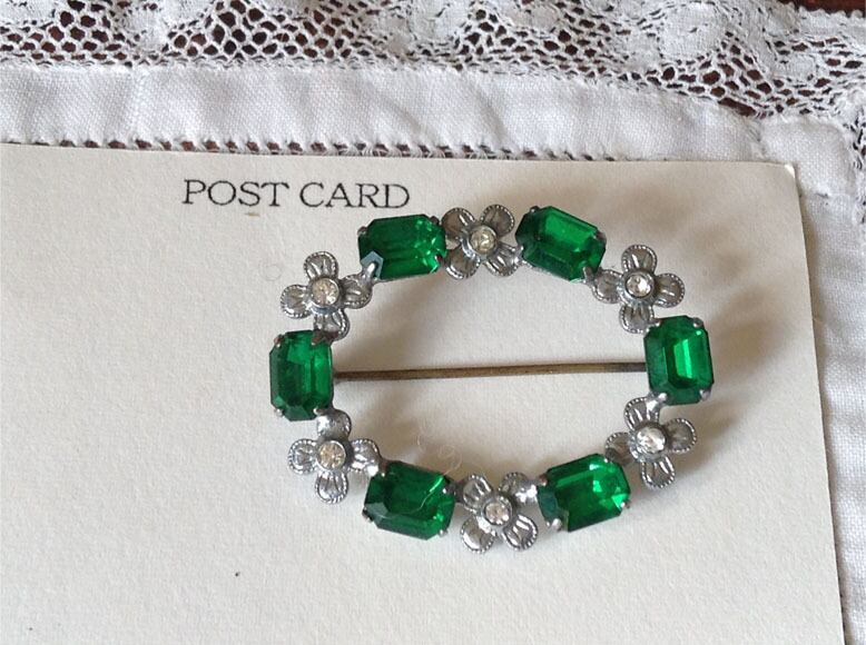 緑の四角いラインストーンとお花が交互にリース状になっているデザインでとても素敵なブローチです。