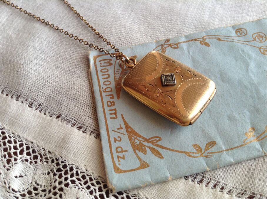 USアンティーク ダイヤモンド入りイニシャルモノグラムスクエアロケットペンダント